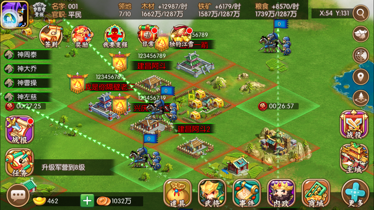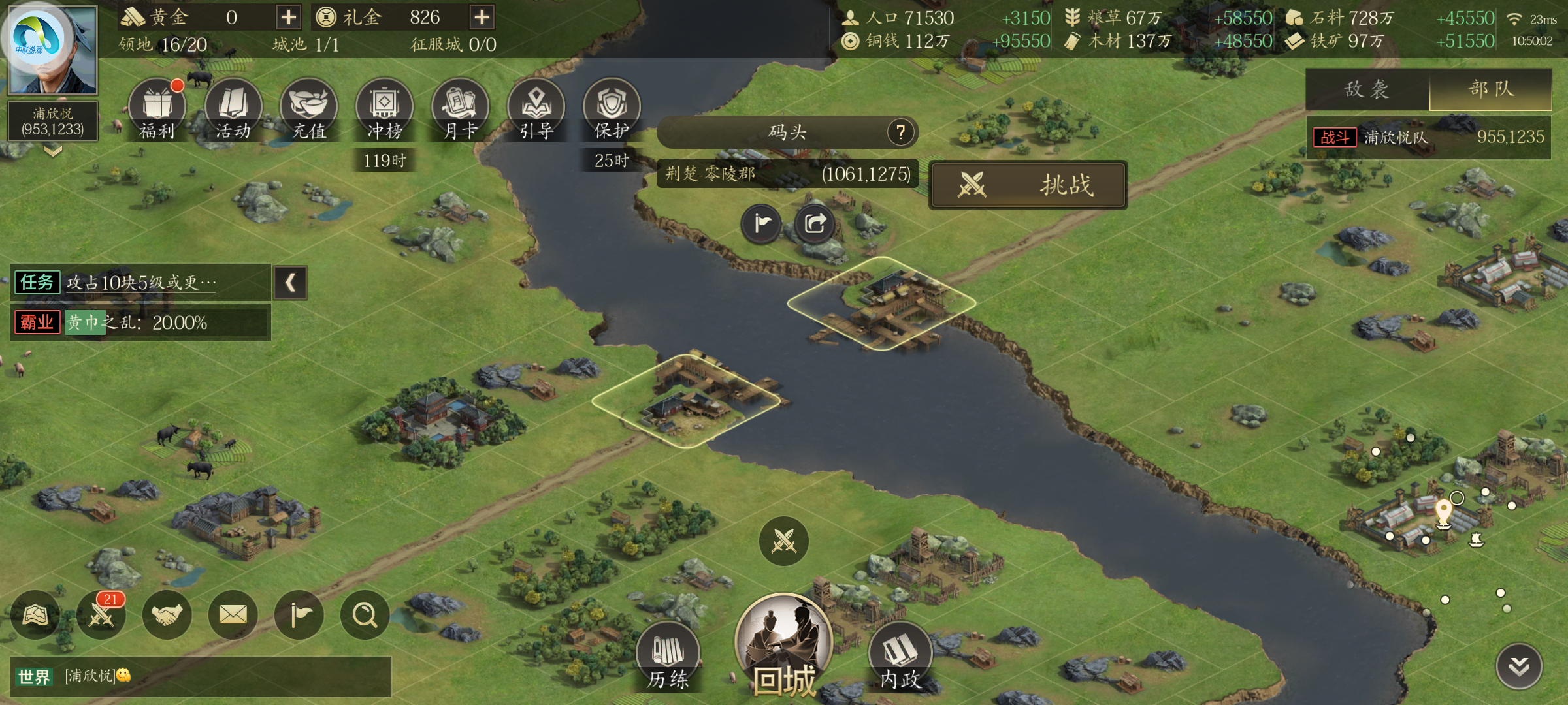 这个游戏地图比较大,有一两千座名城,还有很多野外的城池,攻城抓将抢资源,出征也不用地块铺路,玩法和常见的slg游戏完全不同,还是比较耐玩的。