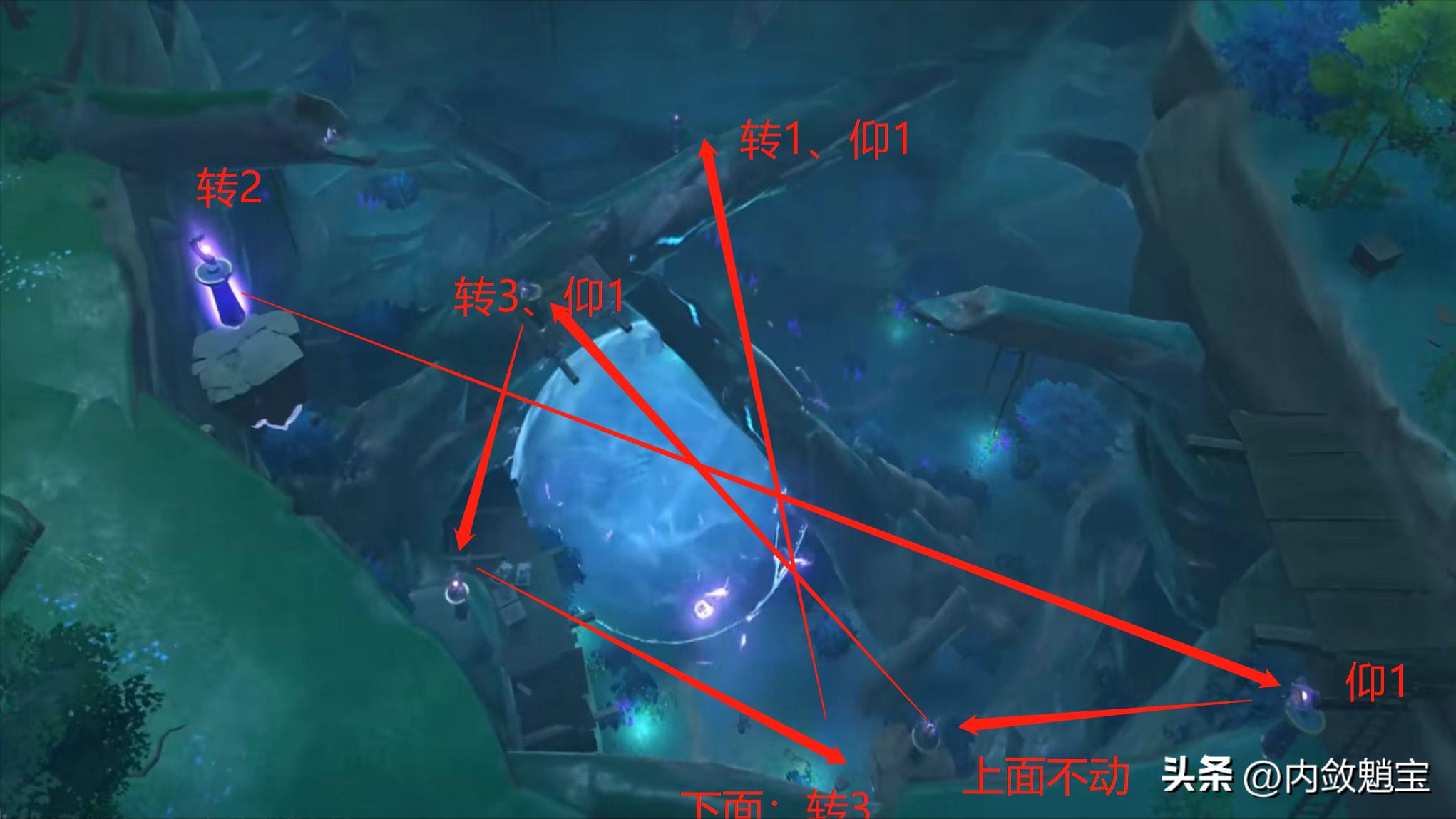 地图右边有个紫色的柱子,名为第一个:调整转向3次(平射,朝向第二个)。地图右上角为第二个:调整转向3次,仰角1次(俯射,朝向第三个)。其他不动。