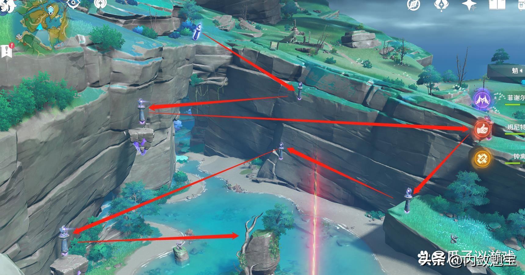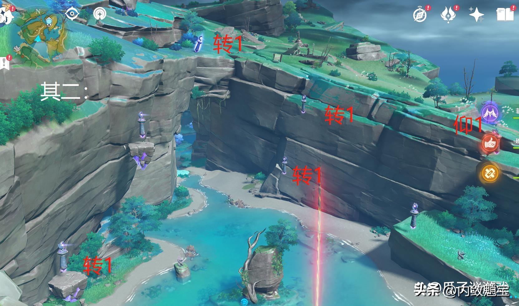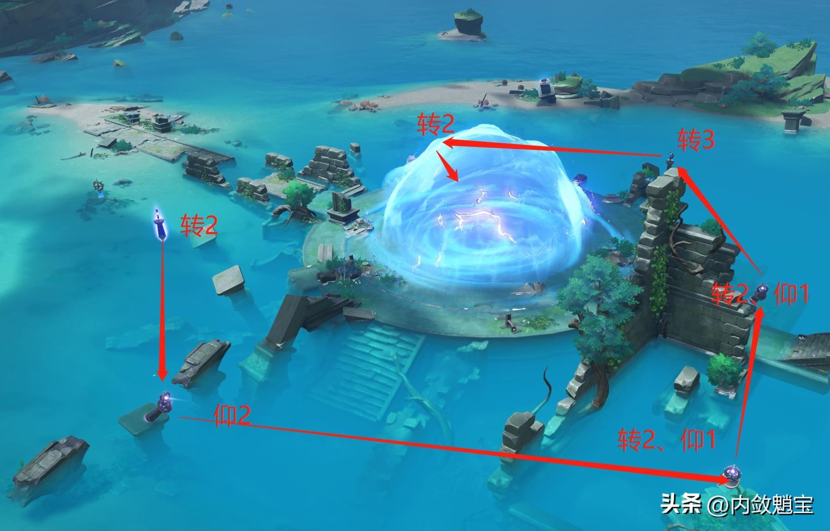 浪船锚点处为第一个:调整转向2次,第二个:2次仰角,第三个:2次转向,1次仰角。第四个(路旁边):2次转向,1次仰角,第五个,3次转向,第六个,2次转向