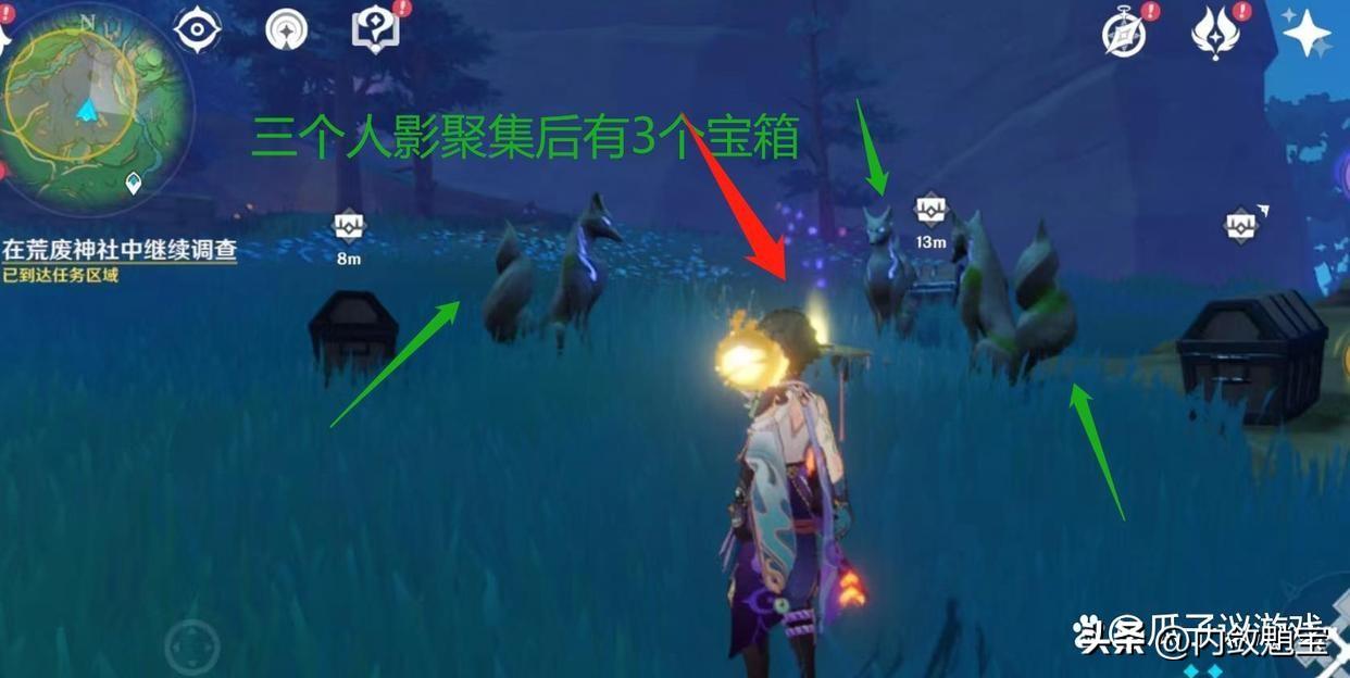 与谜样的人影对话(两次)向地图东北方,神社屋顶上;地图南方,狐狸像前;西南方,树下。全部对话完,得到三个宝箱