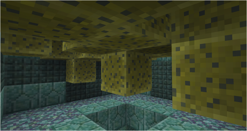 事实上,整个中心区域看似房间众多,但仅有一间被暗海晶石所包裹的宝藏室,我们可以从中获取到稀有的暗海晶石,金块等等稀有方块。