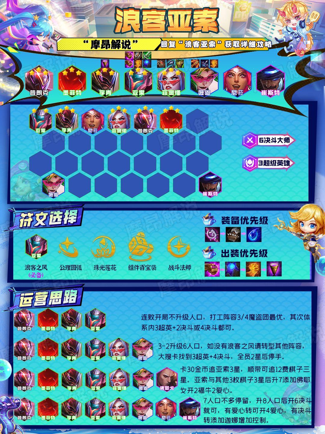 本期摩昂为大家带来的阵容是——浪客亚索。当前环境下遇到亚索的浪客之风一定要拿,分算是直接送手里了。