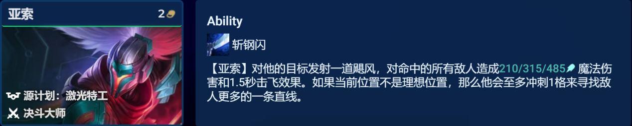 亚索其技能可造成范围群体击飞效果,且3星技能伤害也比较高能造成485的魔法伤害,伤害是比较高的,关键的就是如果亚索感觉其释放技能位置不理想可自己更改1格位置,让技能吹到更多的人。