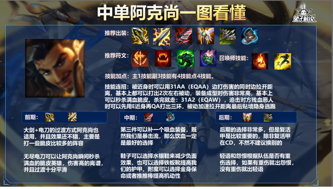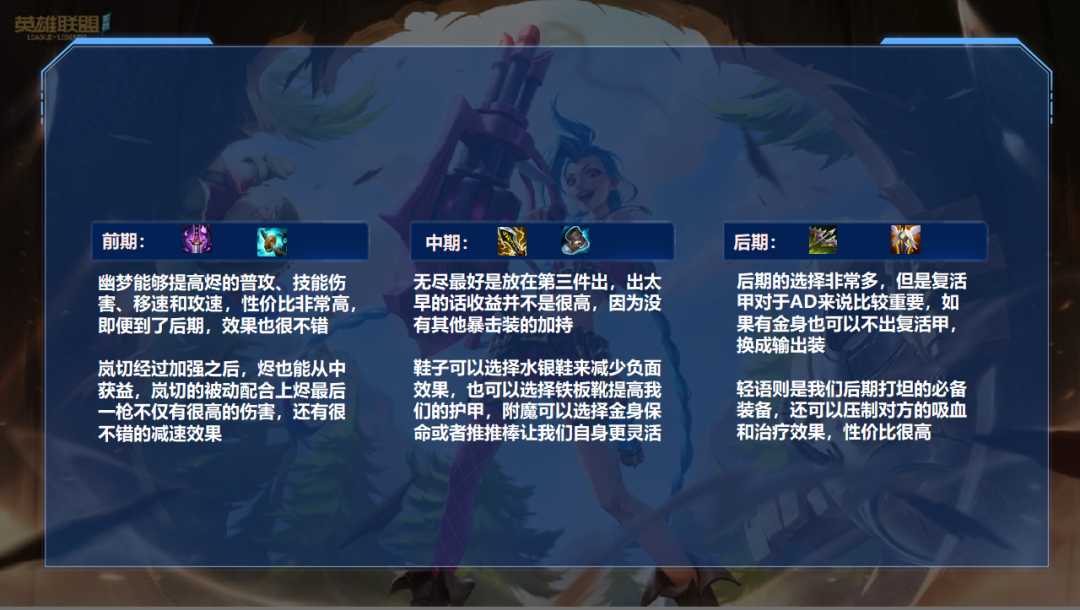 后面的出装可以根据局势选择:轻语、火炮、饮血、怨恨、锋刃、幕刃、饮魔刀或者复活甲,根据队伍和当前局势需要什么来决定,比如需要重伤就出轻语这样子,需要暴击就出火炮饮血。