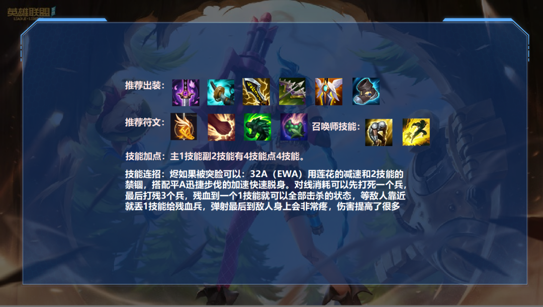 烬如果被突脸可以:32A(EWA)用莲花的减速和2技能的禁锢,搭配平A迅捷步伐的加速快速脱身。对线消耗可以先打死一个兵,最后打残3个兵,残血到一个1技能就可以全部击杀的状态,等敌人靠近就丢1技能给残血兵,弹射最后到敌人身上会非常疼,伤害提高了很多