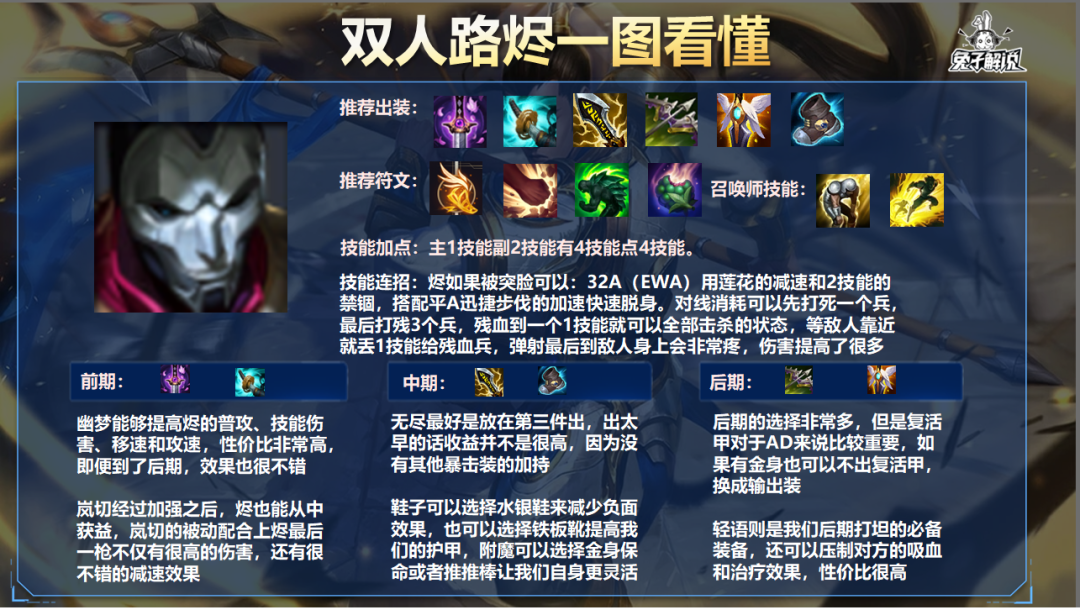 大家好,我是兔子攻略组的大马猴。今天给大家分享一下我最近发现的岚切烬玩法,其实这几个出装我一直在测,主要是考虑到操作的不同,技术不是很熟练的情况下一般比较难打出优势,没有优势的烬更像是一个工具人,所以接下来我会教大家如何打出优势。