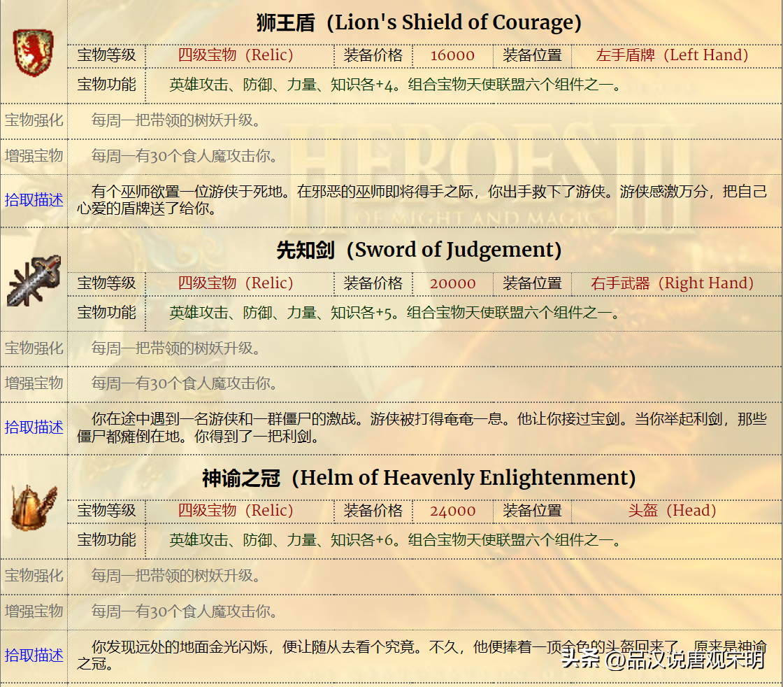 众所周知,英雄无敌3里,除了丰富的兵种、众多的英雄之外,大量效果各式各异的宝物也是亮点之一。