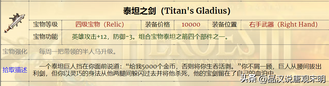 首先呢,这把武器的组成宝物都很强大,泰坦之剑、泰坦之盾、泰坦头盔和泰坦之甲四件都是四级宝物,虽然属性是那种有增有减的极限类型,但是想凑齐也不是那么容易的事情。很多时候,我们除非是在一些超大地图或者运气很好打了多个龙之国,才有可能将这四件宝物凑齐。