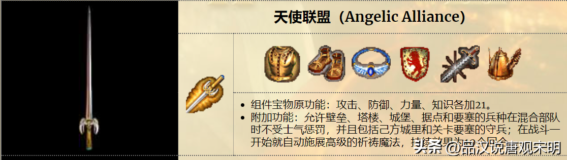 天使联盟是由六件天使系列宝物组合而成的。从二级宝物神奇战甲开始,到最强的四级宝物神谕之冠,这六件天使系列的宝物,可以给英雄提供总计21点的四维加成。堪称所有宝物中属性加成之冠。