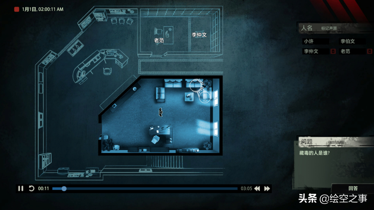 最后安利一款国产单机吧,《疑案追声》是款围绕着“声音”展开的游戏,玩家并不像常见的那些侦探游戏那样在房间中调查线索、盘问线人,最后推理还原真相,而是利用游戏中的声探系统扮演“声探”在一个地图中的各个房间内游走,听取案发现场的声音,最后通过听到的信息拼凑出完整的真相。