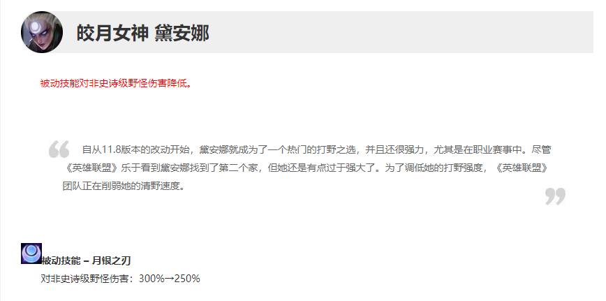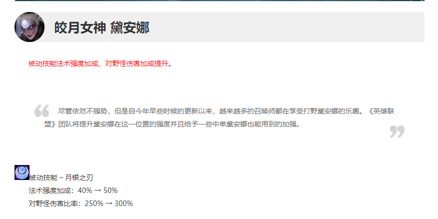 然而就在S12的首个版本,设计师不仅将皎月对于野怪的伤害进行了回调,还略微增加了被动的AP伤害加成,这也让皎月再次成为了韩服高分段目前非常热门的选择!