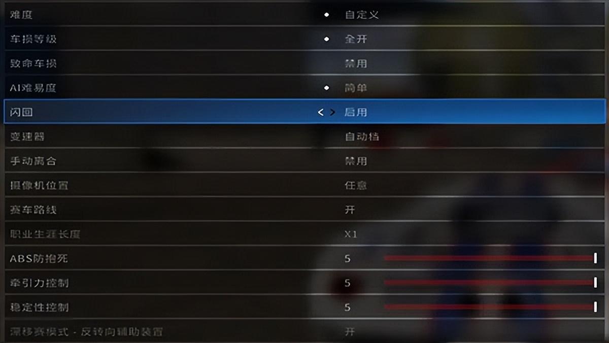另外,还可以针对特定的细节再去改变不同的难度设定:车损、变速器(自动、半自动、手动等)、赛车路线、牵引力控制、稳定性控制等。