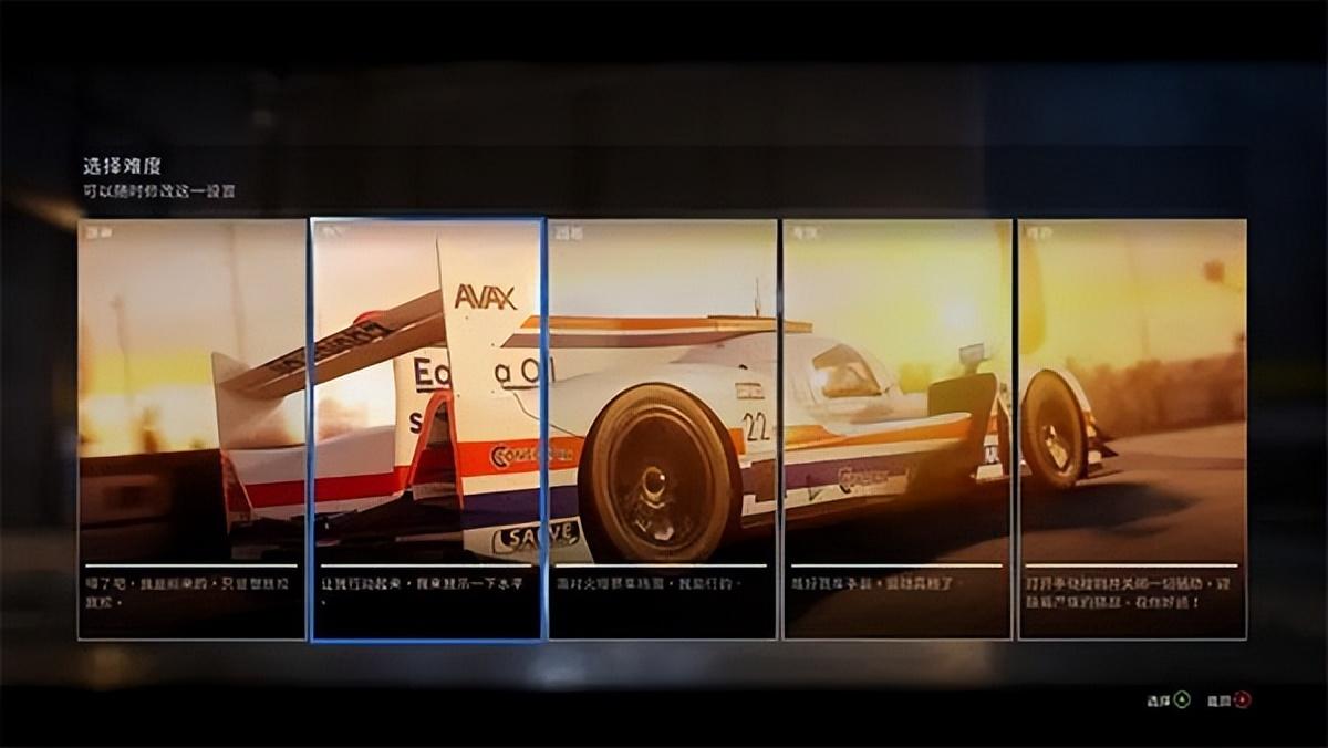 游戏难度分为5种,玩过前作或者有一定赛车游戏基础的可以试着从困难难度上手。更高难度下AI的速度有些作弊的感觉,建议在熟悉游戏后在提升难度挑战。