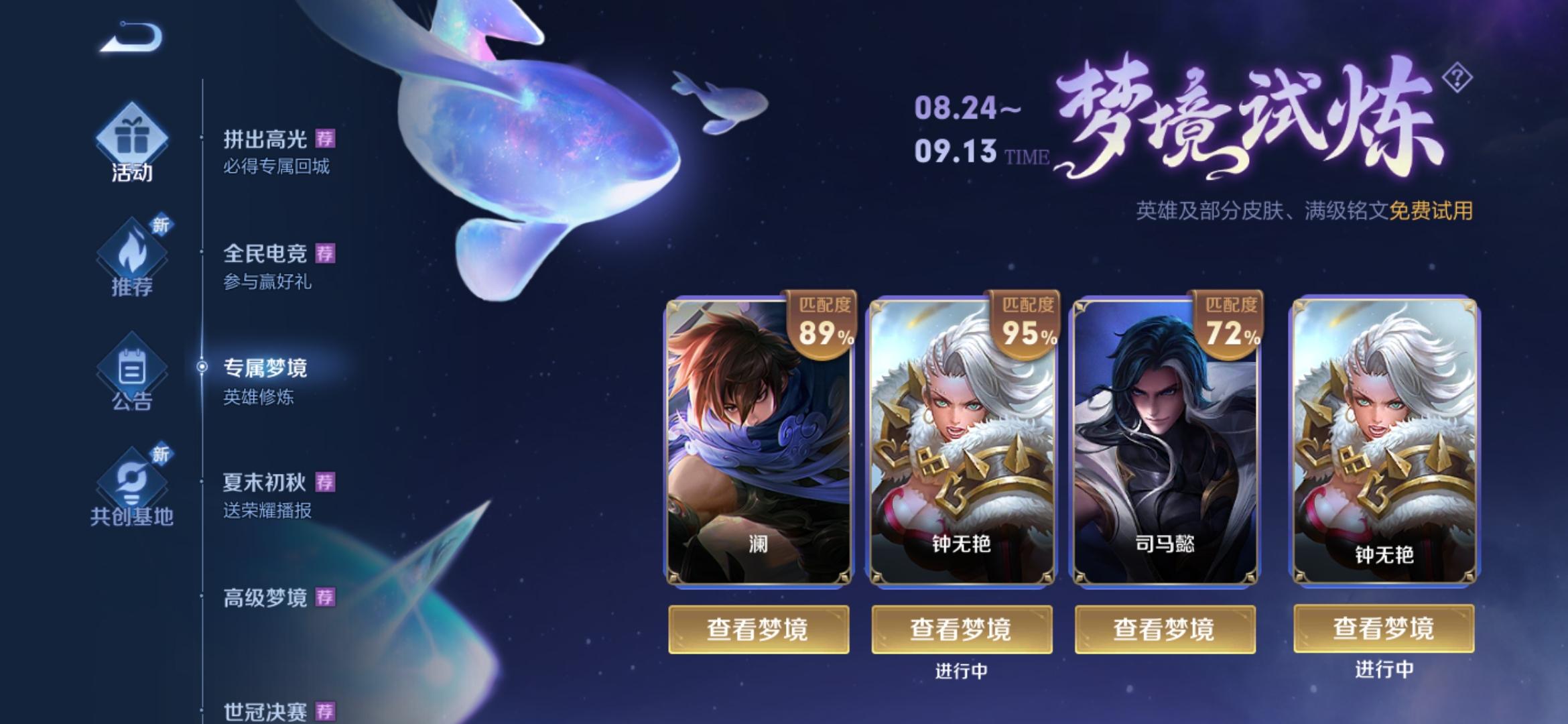 这次的专属梦境活动和以前一样,大家可以在系统推荐的三个英雄中选择自己想要试炼的英雄,选择后即可享受到英雄的一些基本皮肤,如果你不想选择的话还可以自定义英雄进行试炼,这样大家就不用担心英雄不会玩或者是自己不想玩的内容。