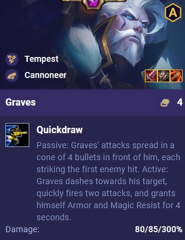 技能:被动:男枪的普通攻击为四颗弹体呈圆锥形散射,每颗弹体造成0.8/0.85/3.0%ad的物理伤害。主动:男枪冲向他的目标,并迅速进行两次普攻,在接下来的4秒内为自己提供50/70/100ap的护甲和魔抗。