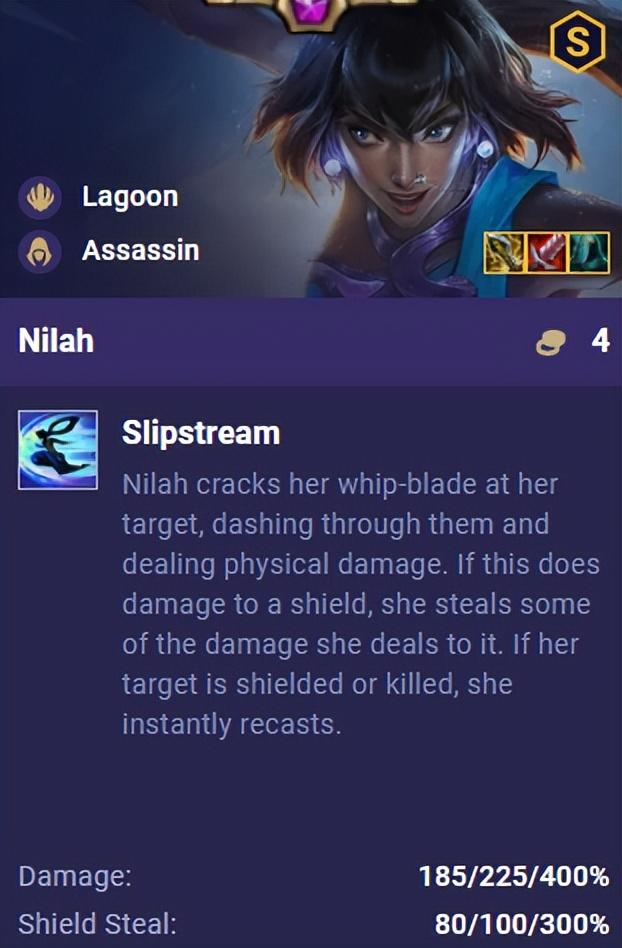 技能:尼菈冲向她的目标,造成185/225/400%物理加成伤害,如果这个技能对护盾造成了伤害,尼菈会偷取伤害值80/100/300%的护盾值,如果目标死亡或是拥有护盾,尼菈会立刻再次释放此技能。