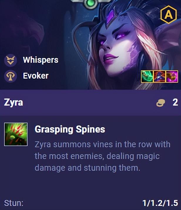 技能:婕拉在敌军最多的一行召唤藤蔓,造成300/400/575ap点魔法伤害,并且眩晕他们1/1.2/1.5秒。