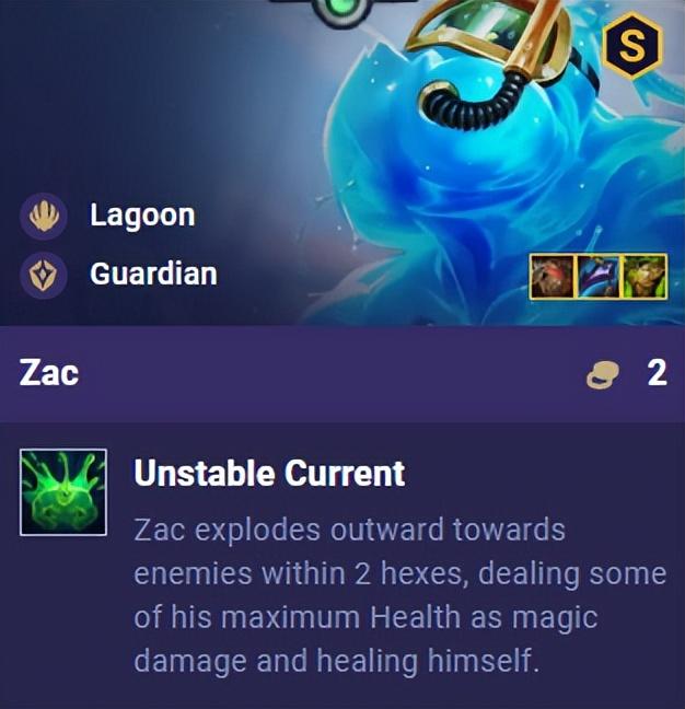 技能:扎克在两格范围内产生一次爆炸,对范围内所有敌军造成5/6/7%ap最大生命值的魔法伤害,并回复自身200/250/300ap生命值。