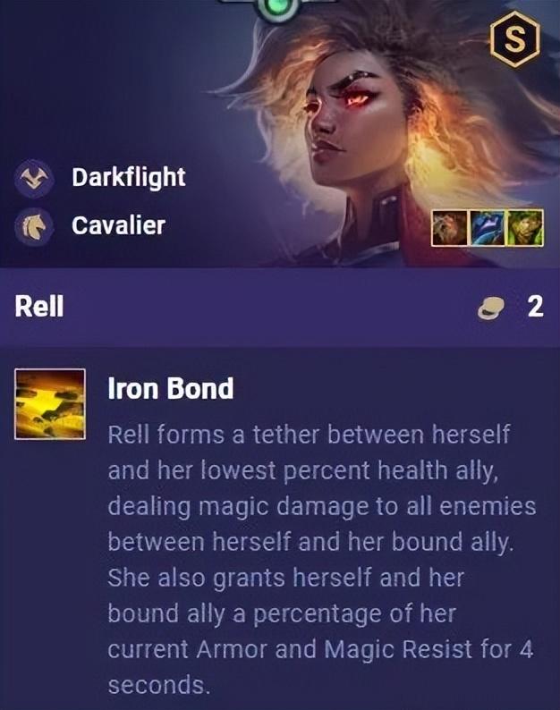 技能:芮尔和距离最远的友方棋子建立一道链接,对身处其中的所有敌军造成150/225/300ap点魔法伤害,并且芮尔会为自己和其链接的棋子提供芮尔当前50%/70%/100%的护甲和魔抗。