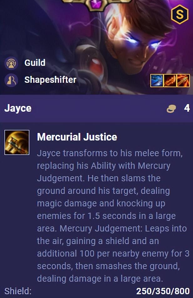技能:杰斯切换到他的近战形态,并将他的技能更改为墨丘利之锤,然后猛击他攻击目标周围的地面,造成3.0ad的物理伤害并击倒一格范围内的敌军1.5秒。*墨丘利之锤:杰斯腾空跃起猛砸地面,对一格范围内的敌军造成2.5/3.0/15.0ad的物理伤害,每击中一个敌方目标为自身提供持续4秒的250/350/800ap护盾并恢复100ap生命值。
