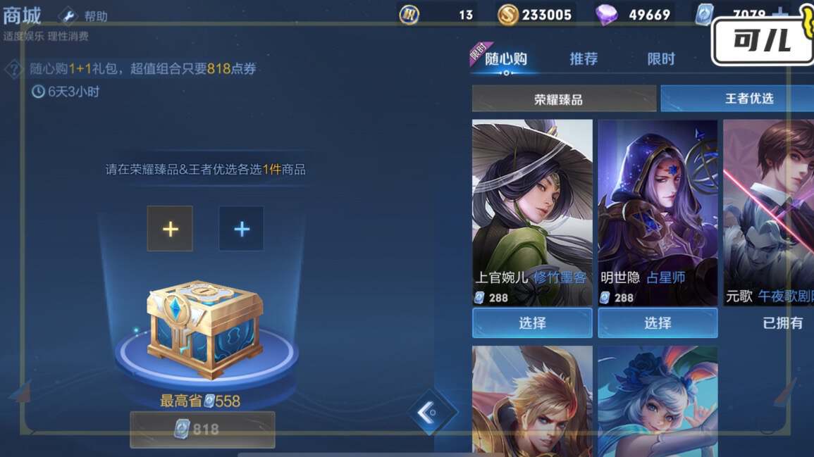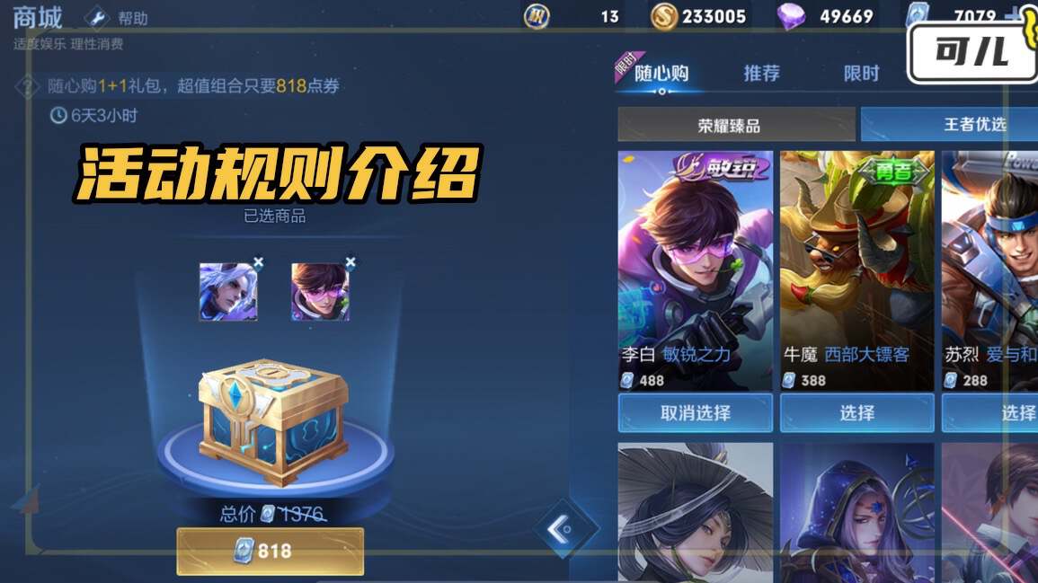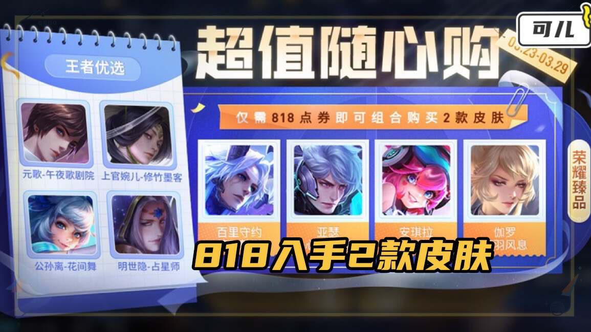 玩家可以选择一款荣耀臻品里面的皮肤和一款王者优选池中的皮肤,两款皮肤加在一起总共只要818点券。
