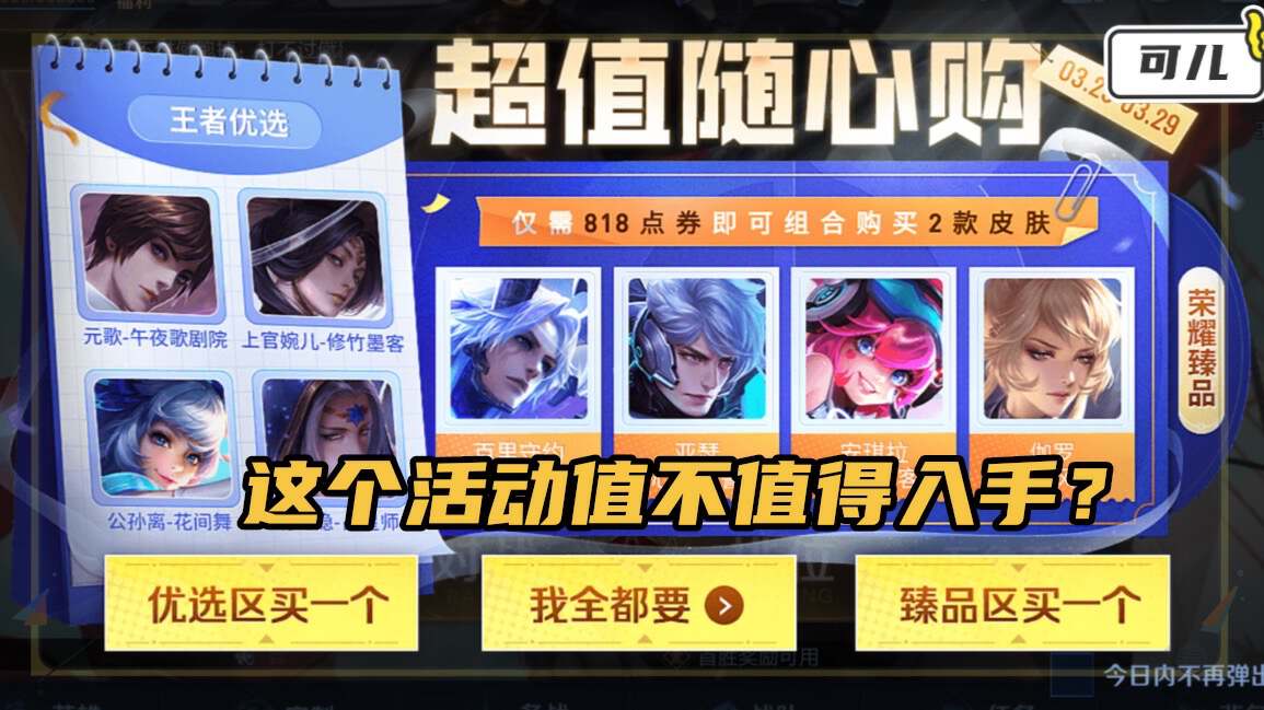 本周更新之后,王者荣耀上线了一个活动,叫做超值随心购,这个活动上线之后,可儿也是看到一些玩家在纠结要不要入手活动中的皮肤。