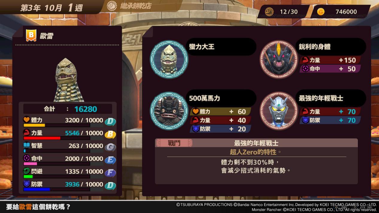 为了让现代玩家更好适应这种“过时”的游戏玩法,《超人怪兽农场》在原本就足够优秀的《怪兽农场2》基础上,进行了进一步的轻量化修改。比如,包括训练和特训在内,游戏中的大部分非功能性的演出都可以被高速跳过;曾经优胜过一次的大会,可以直接查看结果;战斗部分也可以全部交给怪兽自动;就连过去需要通过怪兽合体完成的“能力继承”,也被优化为了再简单不过的“继承饼干”——只要喂下写有特定名称的饼干,怪兽就能获得对应的能力与数值加成。