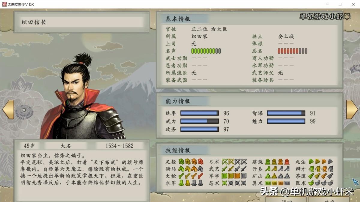 从属性面板上看,大魔王的能力还是非常优秀的。后面最好腾出时间来学习下军学。军学4星的,可以去姬路城找黑田官兵卫学习。