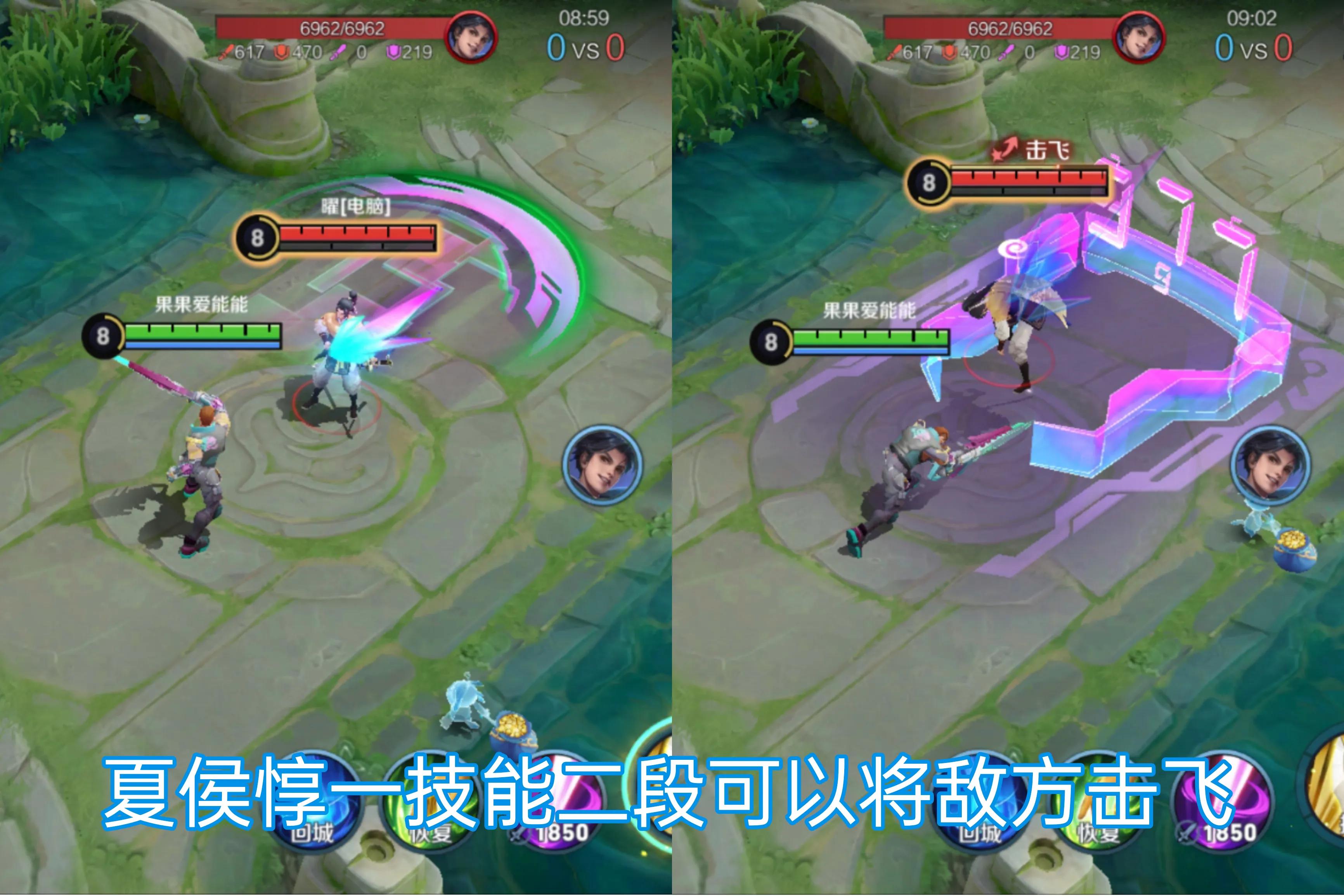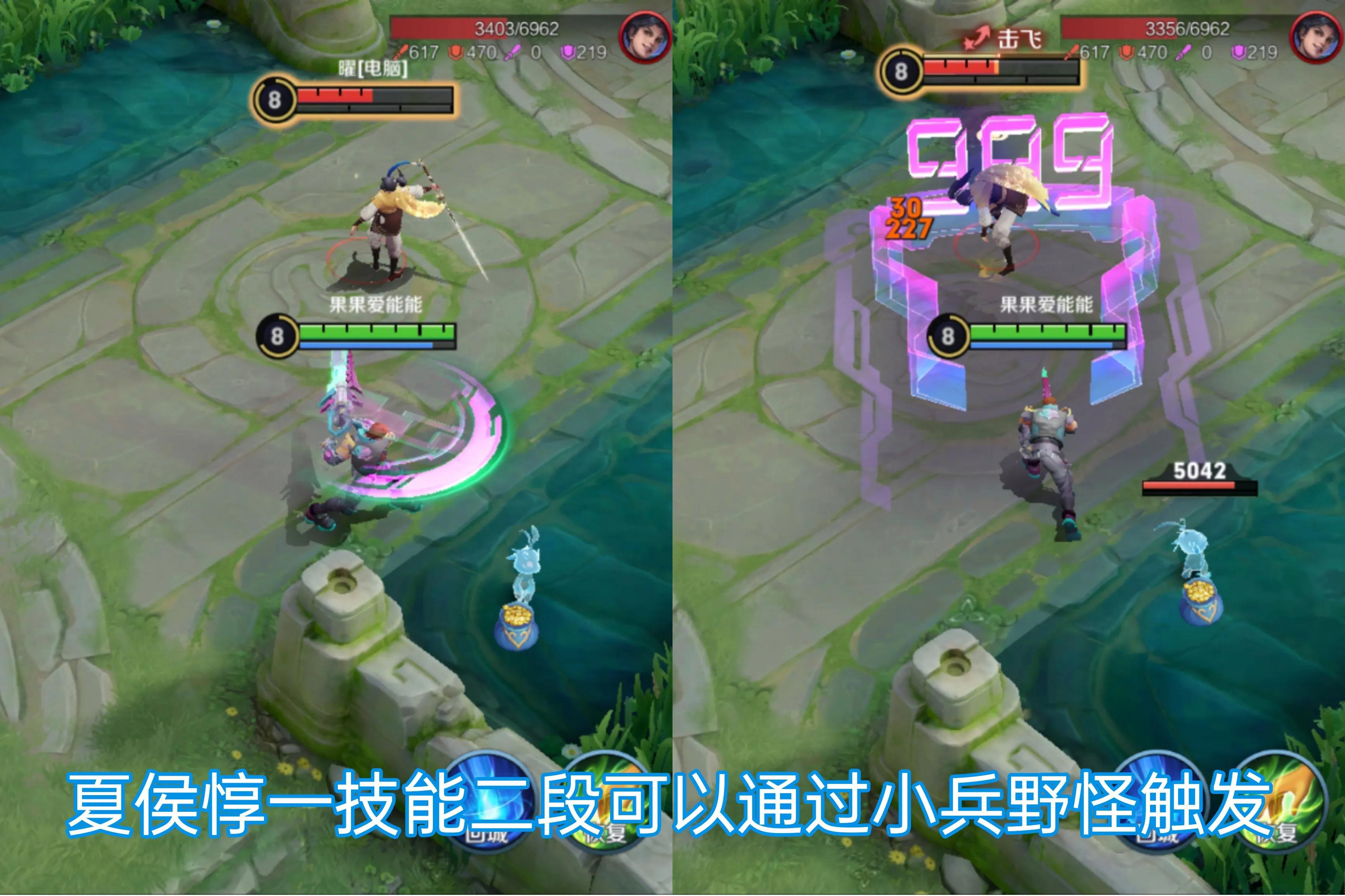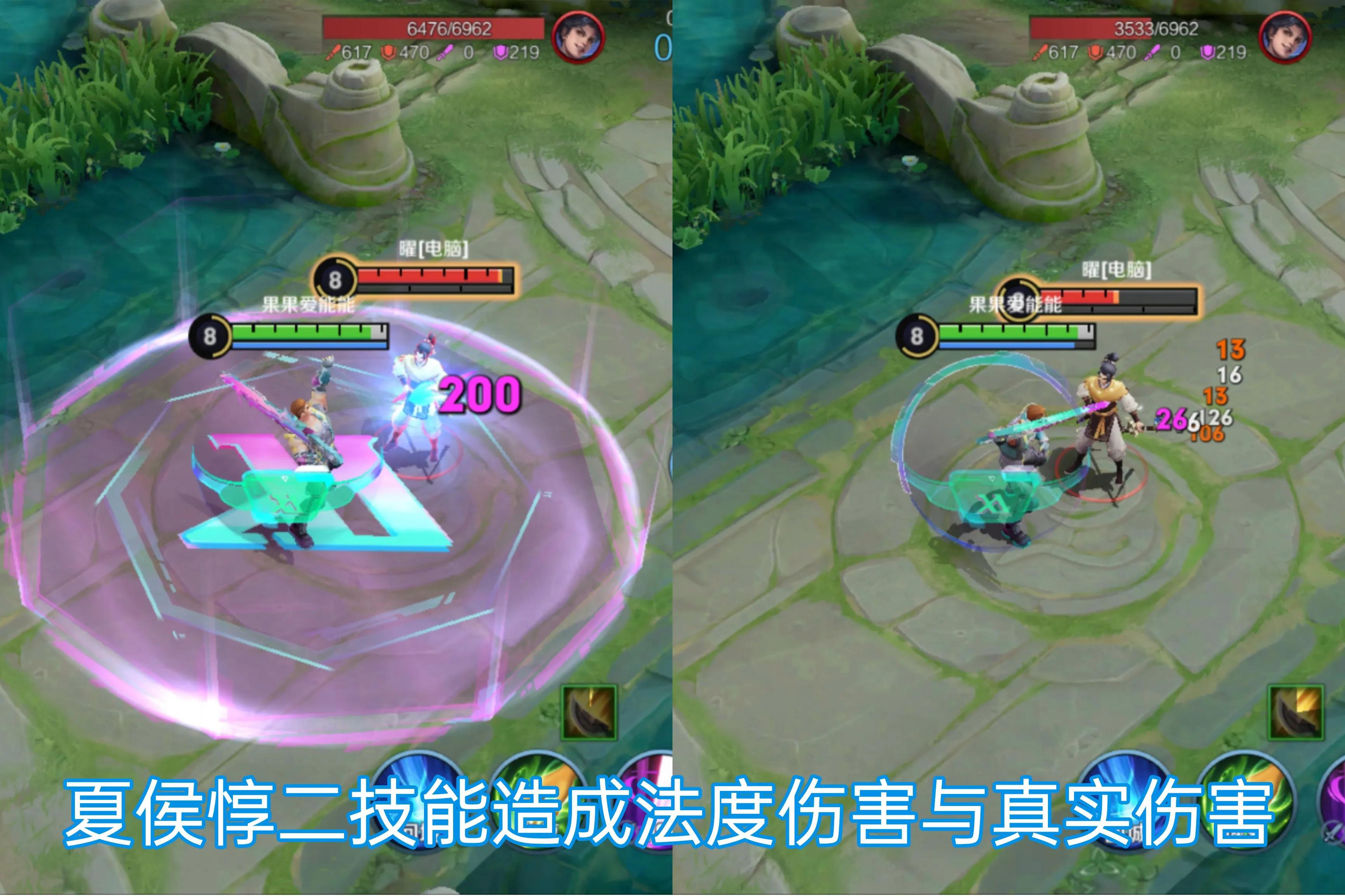 夏侯惇一技能的第一段命中敌方英雄可以造成高额减速,并对敌方英雄造成伤害,而第二段先前只能通过敌方英雄才能触发第二段,而如今被策划优化之后,野怪跟小兵都可以击飞第二段。夏侯惇的二技能可以同时对敌方英雄造成物理伤害与法术伤害,随后自身会获得高额的护盾,护盾值与自身的最大生命值有关,血量越高护盾值相对也就会越厚,并且随后的三次强化普攻还会对敌方目标额外造成真实伤害,另外每次强化普攻都会减少夏侯惇大招的冷却时间。
