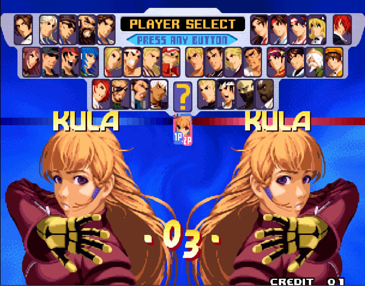 稍微麻烦一点的就是《拳皇2000》中的库拉, 玩家想要使用的话,必须严格按照秘籍才能使用。在选人画面时,将光标移至薇普按“开始键”,下移至温妮莎按“开始键”,右移至塞斯按“开始键”,左移至马克西马按“开始键”,右移至K'按“开始键”,再进入“?”选项格“开始键”一次,再输入“上、下”即可,此时我们在“?”下面就能看到库拉了。