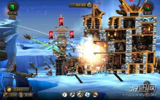 游戏中,首先你可以使用各种攻城器械轰塌敌人城堡,如弩箭,石块,铁球等,这物理投掷的玩法分分钟令人联想到《愤怒的小鸟》。但是不一样的地方是,玩这游戏你还可以不用“家里蹲”,当地面出现战旗时,你就得派出小兵前去抢夺了。当然,对面如果不傻自然也会派兵遣将,这时你不但得控制城堡进攻,还需要掌控地面的战局。小兵也分很多类别,有弓箭手,有骑士,还有先锋等,怎样排兵布阵全在于你的掌控。小兵撑不住了?没事法师和肉盾前来救场,特殊兵种也无济于事?那是时候派出英雄单位了,不过英雄需要你亲自操控,上下左右键移动,加上技能释放系统,这似乎又成动作游戏了……