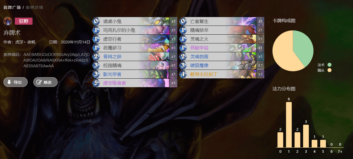 术士这个职业其实还真就应验了异灵术老师的"弃牌术天下第一"规律,作为远古卡组之一的弃牌术因为对决模式的上线又重回巅峰,在有了新的宝藏卡牌后强度更是直线爆表直逼T1,大有"你强任你强,我打弃牌术"的架势。卡组代码:AAEBAf0GDzDOB9SzAry2AqzLA7jOA9fOA//OA8/RA9XRA+fRA+zRA8zSA83SA87SAwAA。