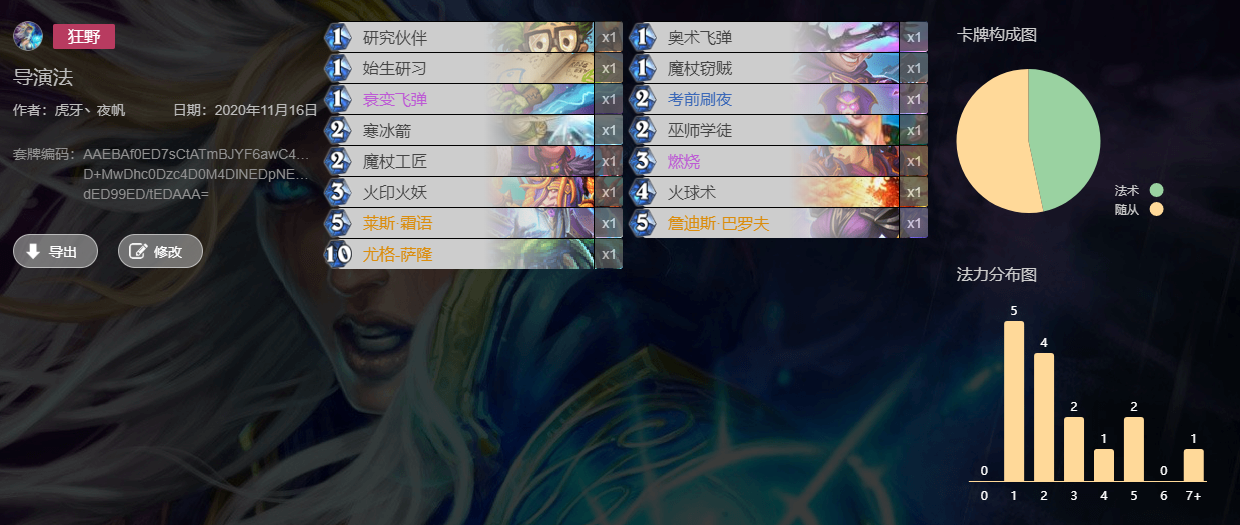 对于法师而言,掌控场上节奏极为重要,整套卡组以低费法术及法强为主,前期通过技能补刀召唤法力浮龙,辅助低费法术直接养大,中期则用衰变飞弹、奥术飞弹、燃烧、寒冰箭等法术在解场的同时增强己方法力浮龙攻击力,如果对方解场同样强力也可拖到后期直接拍上导演,上演"生死由命"的套路,可以算得上难得的攻守兼备卡组。