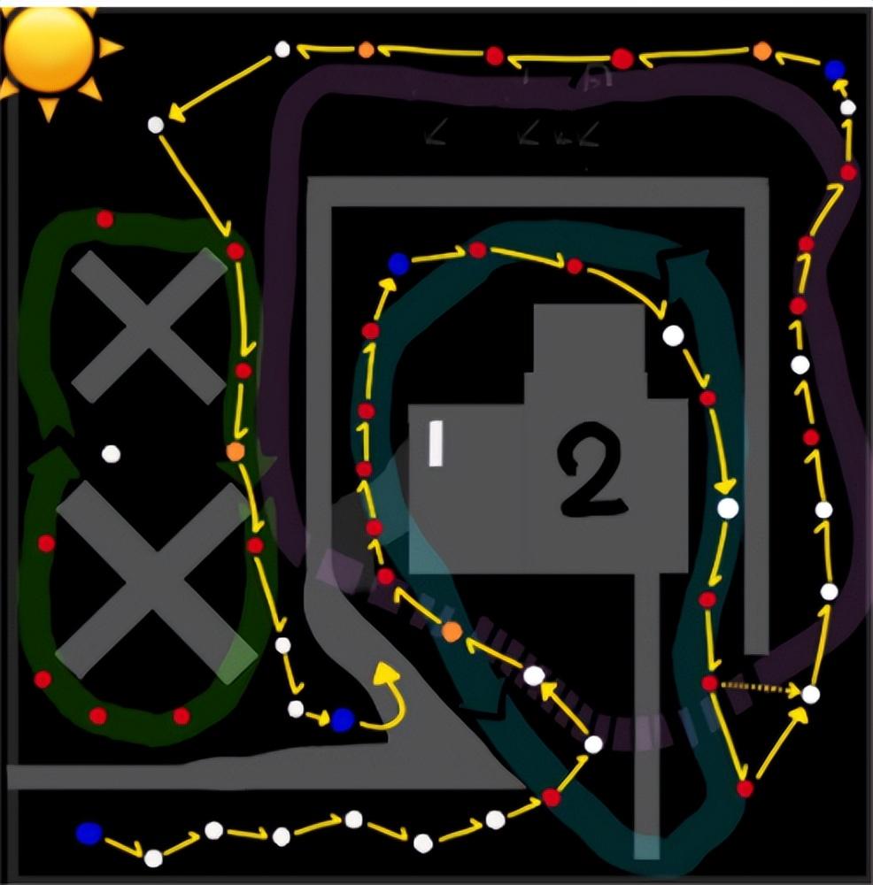 注意:完整箭头是指向的烛火点停留到影子飞过去再走,有火球攻击,半箭头一次性走过,直到下个完整箭头。