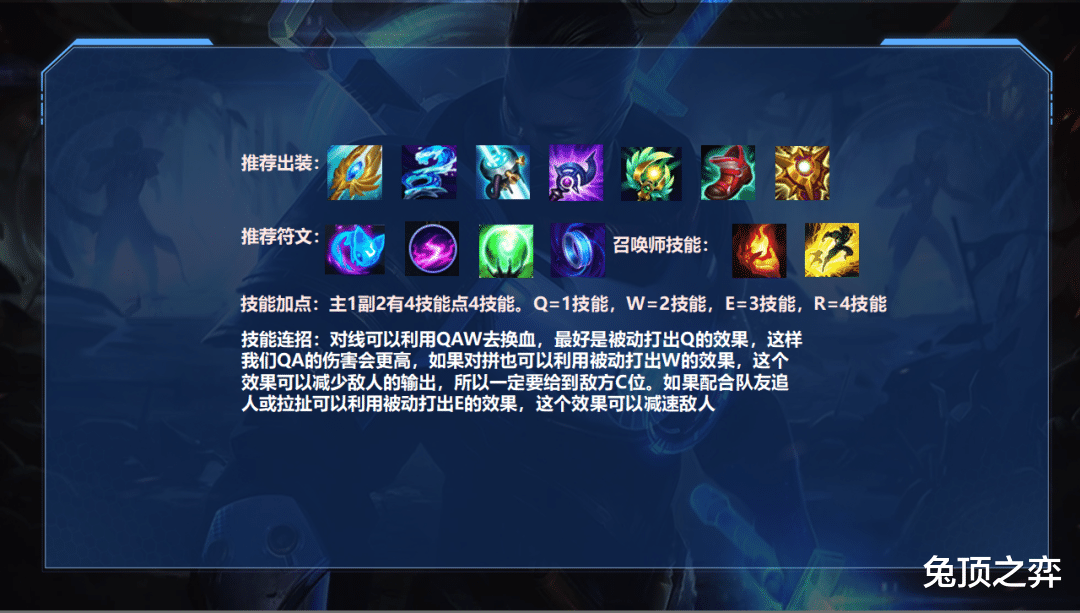 对线可以利用QAW去换血,最好是被动打出Q的效果,这样我们QA的伤害会更高,如果对拼也可以利用被动打出W的效果,这个效果可以减少敌人的输出,所以一定要给到敌方C位。如果配合队友追人或拉扯可以利用被动打出E的效果,这个效果可以减速敌人