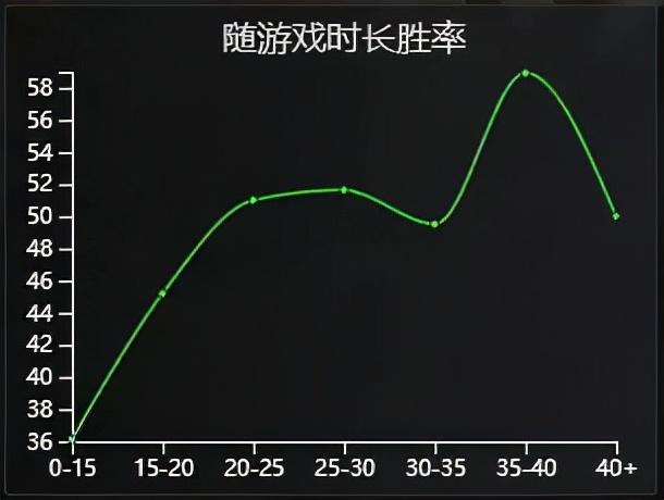 上图为盖伦在大乱斗随游戏时长胜率的变化。可以看到盖伦前20分钟胜率都不足50%,足以证明盖伦前期的孱弱。