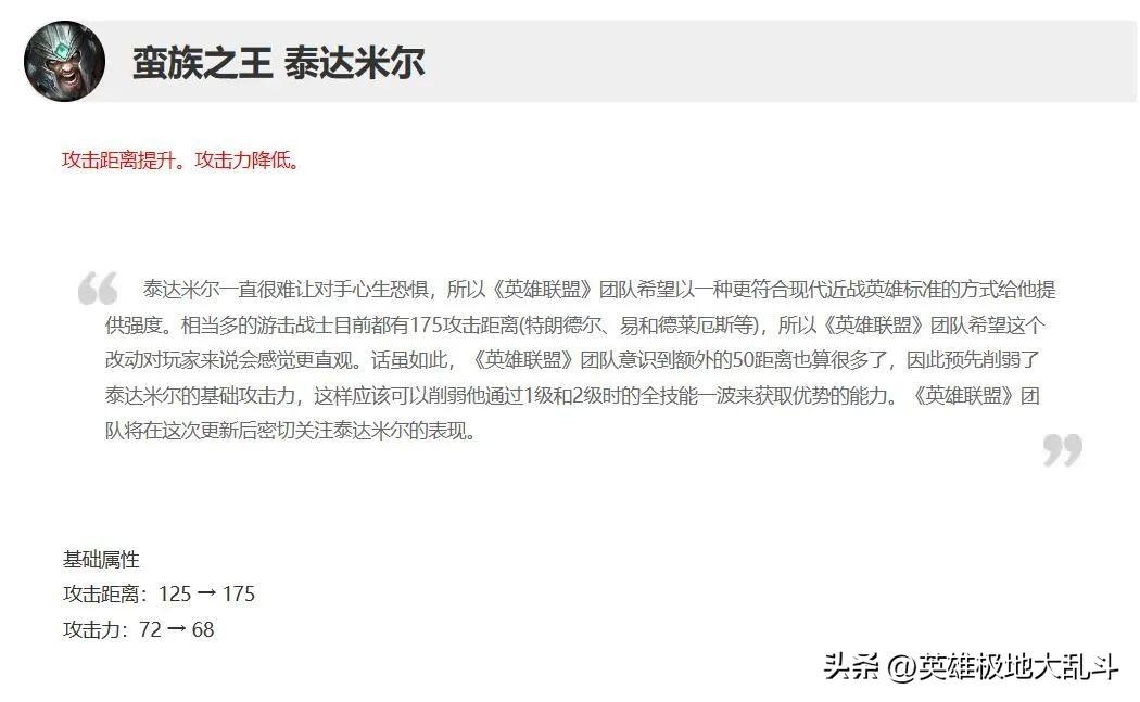 13.17版本只是把蛮王输出伤害从115%降至110%,这5%的削弱对于蛮王来说根本算不上什么,因为13.17版本蛮王基础攻击距离加了50点!