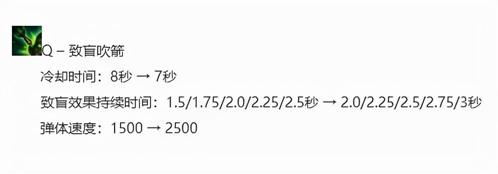 11.21版本提莫Q技能大加强:冷却时间全等级7秒,满级Q致盲3秒,且弹体速度大幅提升。这样面对弹体速度快的英雄提莫Q技能速度更快,避免多受到一次普攻伤害。