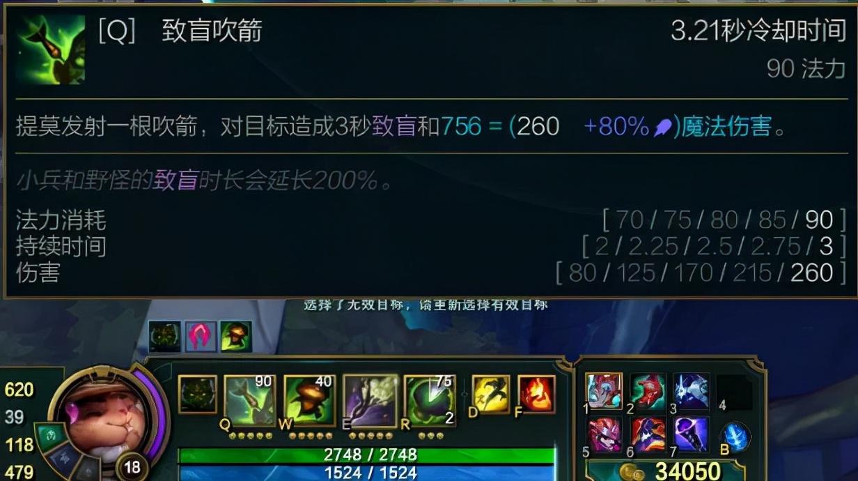 在六神装下,提莫Q技能CD只有3秒出头,而致盲就持续3秒,在敌人韧性为0的情况下几乎等于无限致盲该敌人。