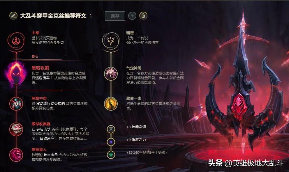 主系符文:黑暗收割+恶意中伤+眼球收集器+终极猎人