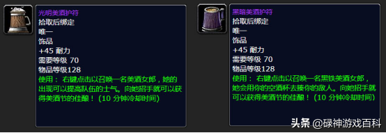 128装等的饰品二件,分别是【光明美酒护符】和【黑暗美酒护符】,都是召美女,但效果大不相同。【光明美酒护符】召出的美女能提高士气,【黑暗美酒护符】召出的黑铁女能暴揍敌人。一样装一个,二个美女一起出动,是不是很带感?