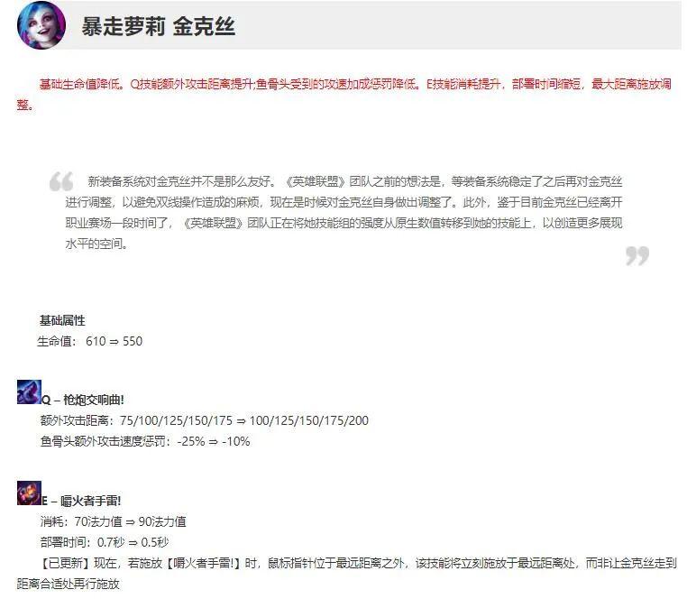 11.3版本虽然削弱了金克丝的基础生命值,但Q技能攻击距离提升了25点!且炮形态攻速惩罚只有-10%了,加上E技能部署时间缩短和优化施放方式,金克丝团战输出会更给力,攻击距离的增加换基础血量削弱非常赚。