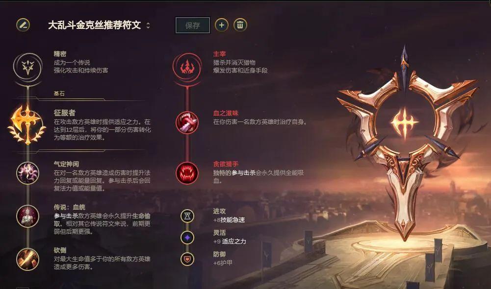 血统+血之滋味+贪欲猎手让金克丝续航拉满,不怕消耗。