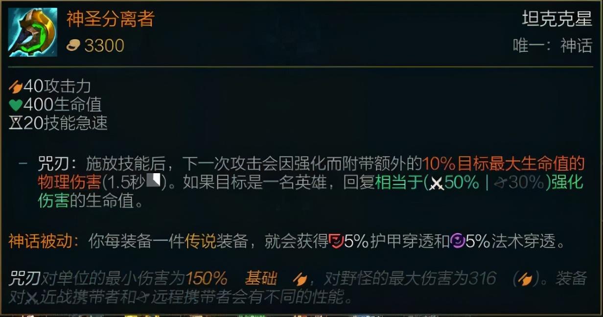 出到神圣分离者后只要Q到英雄加上狗头被动就能回复大量生命值,同时还附带10%最大生命值伤害,提升狗头打坦能力。