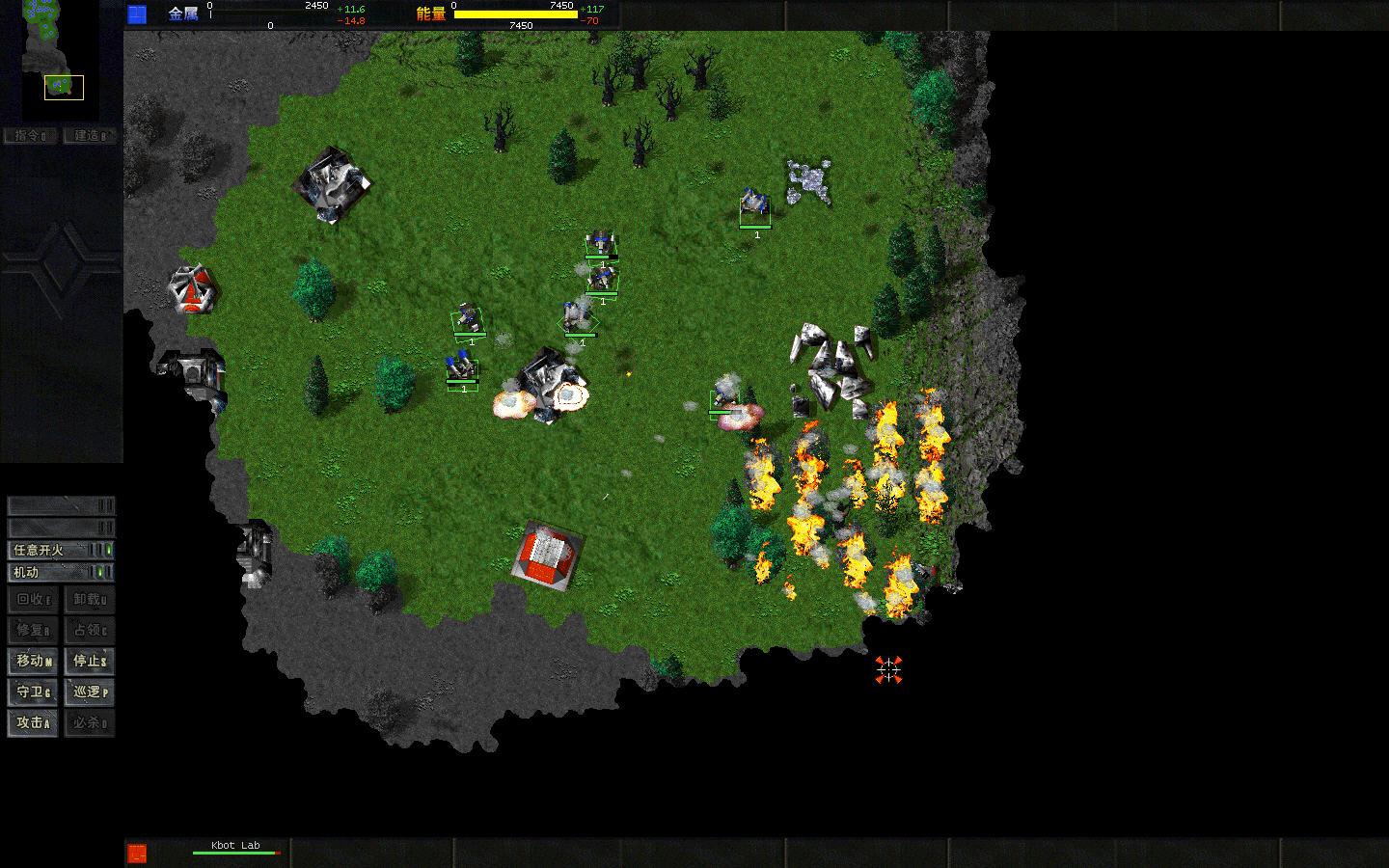 《横扫千军》(Total Annihilation)1997年由Cavedog推出的第一款立体即时战略游戏,故事背景大致讲的是宇宙中两家势力ARM和CORE之间的冲突,所以游戏中只有两个势力可选。这个游戏跟别的即时战略游戏相差很大,一般的即时战略游戏开局都会有个总部(基地),这个游戏很特别的开局只给一个机器人,名曰指挥官(Commander),所有的一切都从这个指挥官开始,可以建造基本的发电站、采矿场、车间、防御等设施,游戏默认设置为指挥官被杀死时,则游戏结束,所以需要重点保护。