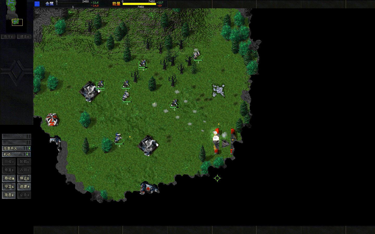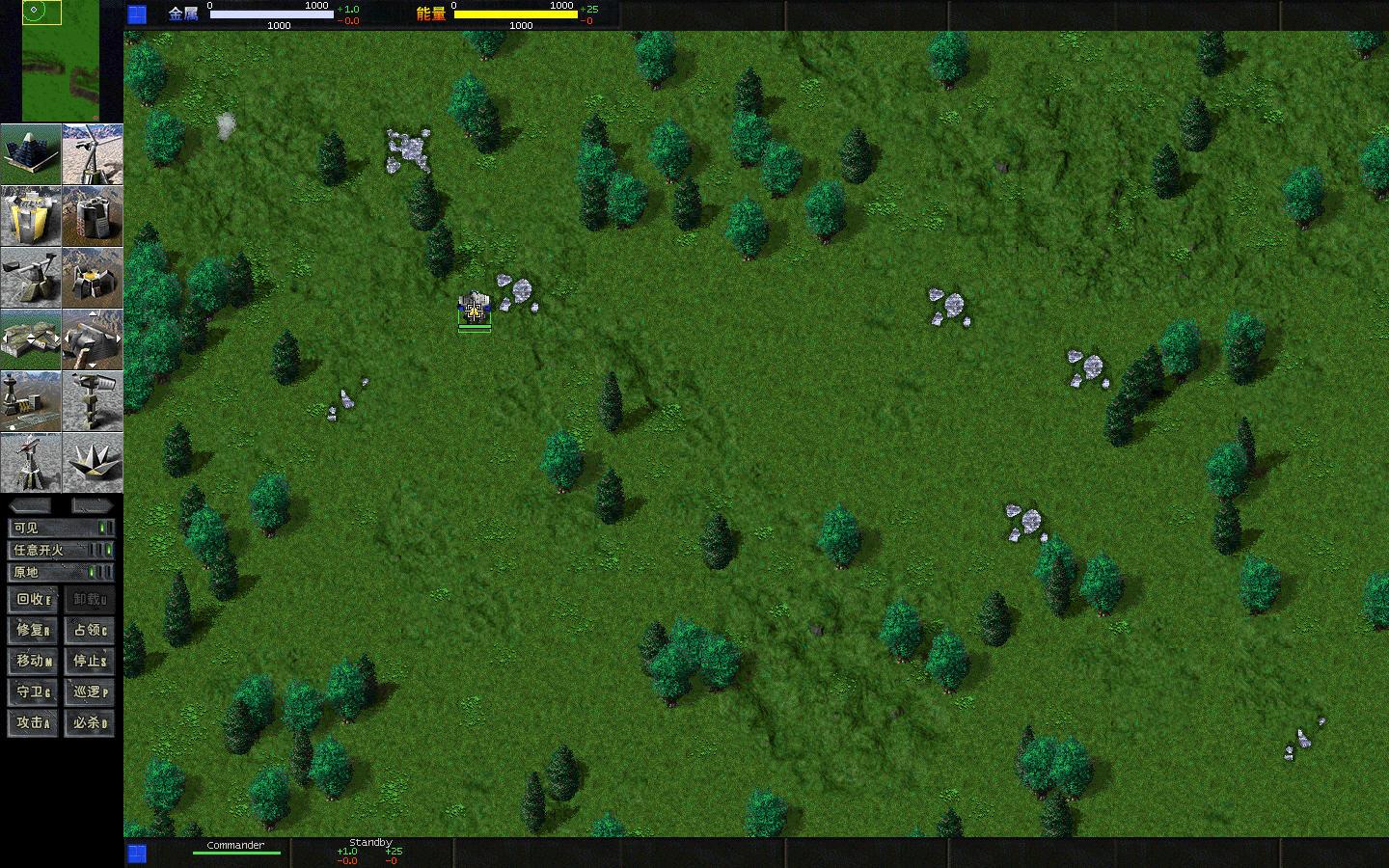 游戏中的资源有两种:金属和能量,通过建造金属提炼器获得金属加成,建造各种电厂(太阳能、风能等)来获得能量。金属提炼器只有修建在地面上裸露的金属矿点上才会生效,需要注意的是游戏中存储的金属和能量是有上限的,所以还需要建造金属仓库和能量仓库,这样才能增加两种资源的储存最大值,避免产能溢出。游戏除了可以自动采集资源以外,还可以通过手动获取,地图上的树木、石头等可以让指挥官吸取为能量,而战斗过后,各种单位和建筑物的残渣都是可以被回收为金属的,这个可以打扫战场的设计在当时确实很少见。