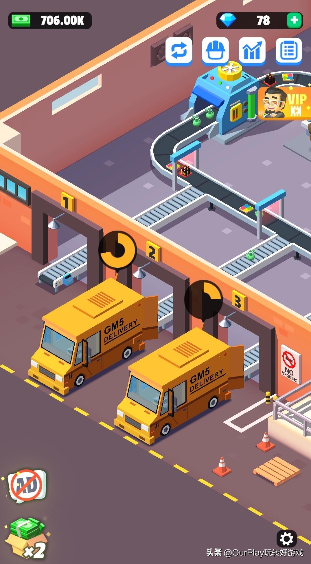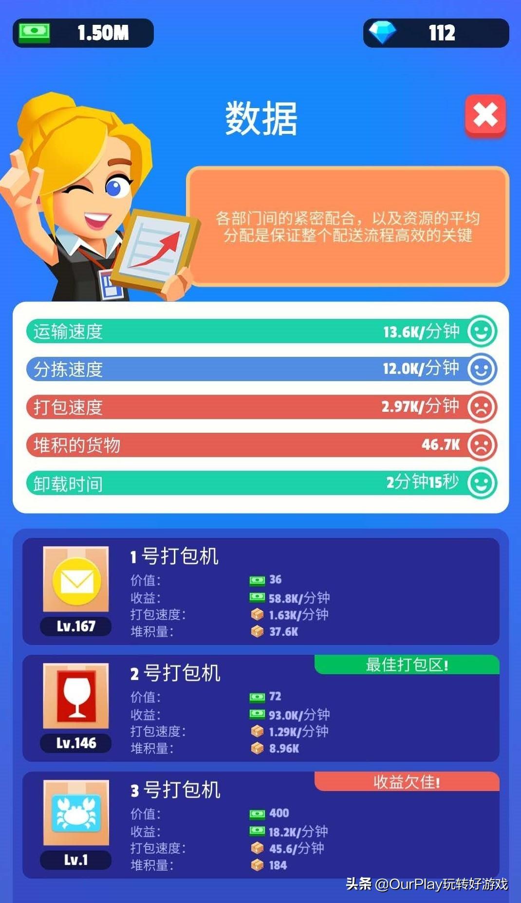 然后通过购买运输车,增加卸货口,升级分拣机。提升运输能力,运输更多的货物。只要确保有足够的运输能力来提供取件服务,就可以提高收入。