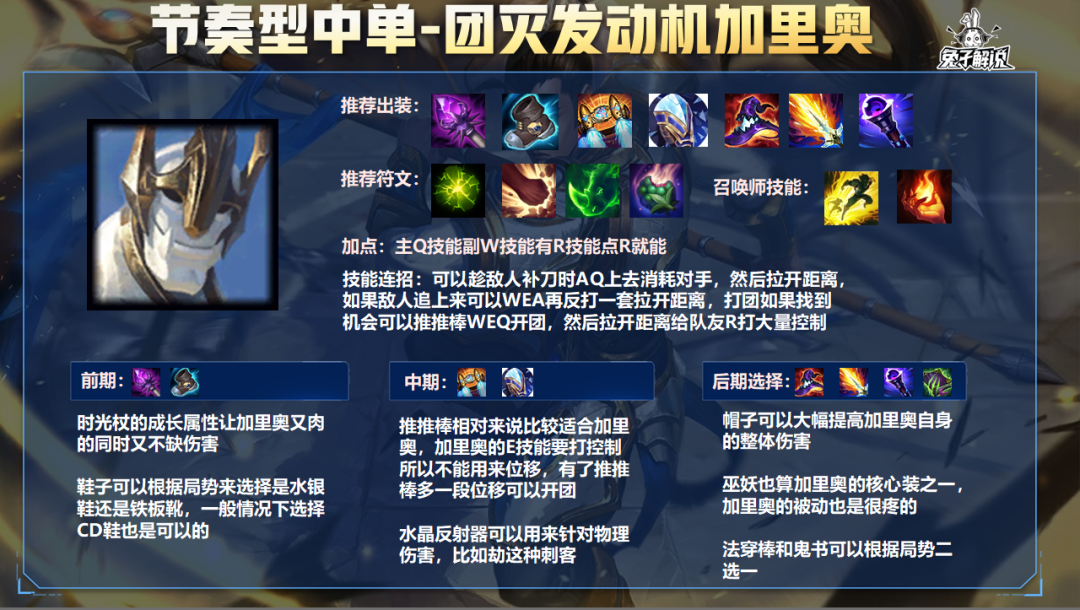大家好,我是兔子攻略组的大马猴。今天给大家推荐目前版本T0的节奏型中单加里奥,这个英雄非常适合大家拿来上分,只要思路正确,是没有上不去的分的,并且这次的改动也丝毫没有影响到加里奥目前的T0强势地位,是上分的一大神器。Q=1技能,W=2技能,E=3技能,R=4技能