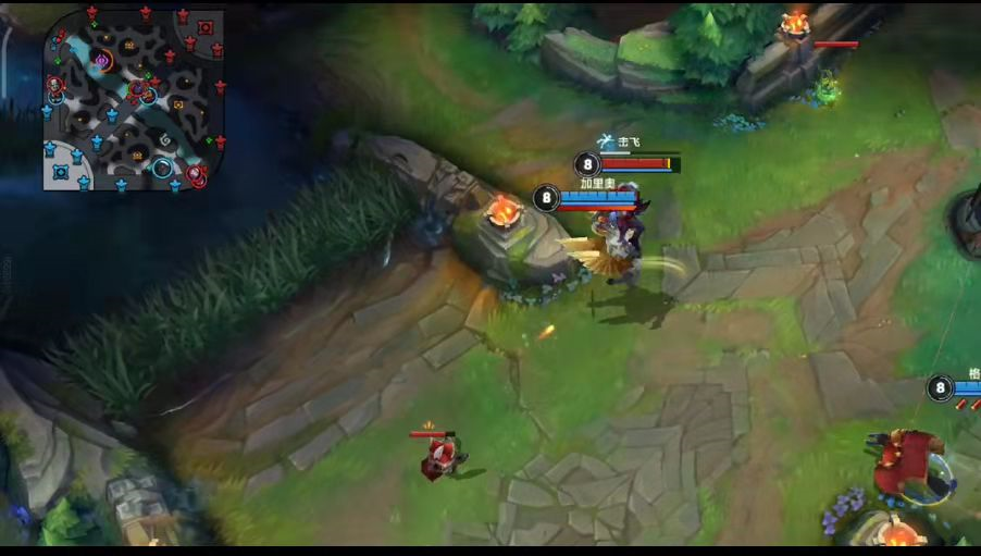 如果对线手短的英雄,一级可以迅速清完线去做河道视野,防止对方打野3级来gank中路,前期加里奥没有很好地逃跑手段,E技能也有可能被对方挡住,所以一般我们不打对线,就游走支援队友打节奏,帮助队友以多打少来建立优势。