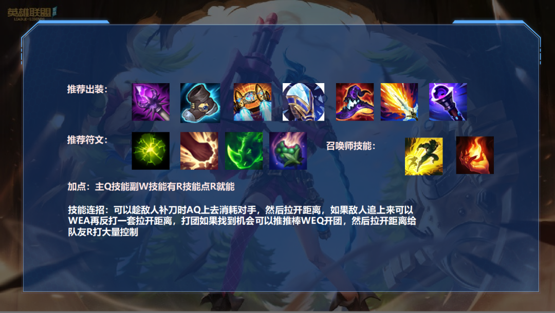 可以趁敌人补刀时AQ上去消耗对手,然后拉开距离,如果敌人追上来可以WEA再反打一套拉开距离,打团如果找到机会可以推推棒WEQ开团,然后拉开距离给队友R打大量控制